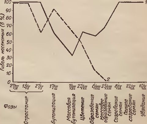 Рис. 2. Токсичность водных настоев луковиц (1) и листьев (2) зигаденуса элегантного в разные фазы вегетации 1949 г.
