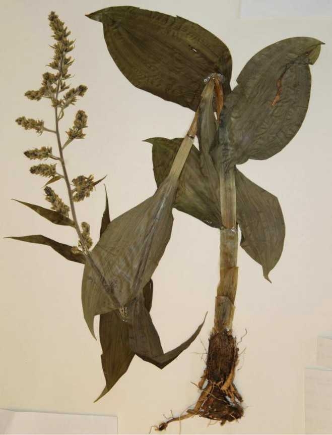 Чемерица Лобеля (Veratrum album var. Lobellanum Bernh.). Это растение иногда неправильно называют белой чемерицей. Многолетнее травянистое растение с прямостоячим стеблем, высотой до 170 см. Нижние листья широкоэллиптические, верхние яйцевидно–ланцетные, все заострённые, покрытые коротким пушком. Мелкие желтовато–зелёные цветки собраны в соцветие метёлку длиной 20—60 см. Цветоносы и цветоножки пушистые. Корневище мясистое, тёмно–бурое, длиной 5– 8 см. От корневища отходит много сочных, шнуровидных, толщиной до 4 мм корней (рис. 4).