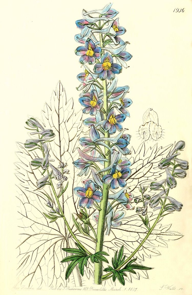 Живокость редкоцветная (D. laxlflorum D. С.) – многолетнее травянистое растение, стебель высотой до 75 см, опушённый в нижней части; тёмно–синие цветки собраны в рыхлые метёлки на верхушке стебля и на 2—3 ветвях.