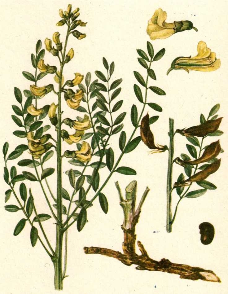 Аморфа кустарниковая (Amorpha fruticosa L.). Декоративный кустарник, высотой до 2—3 м. Происходит из Северной Америки, произрастает в южной половине европейской части СССР в парках и полезащитных полосах.