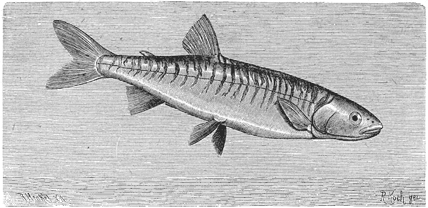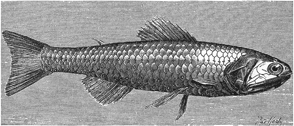 Большинство видов светящихся рыб, свойственных исключительно морю, принадлежат к глубоководным рыбам и встречаются только в открытом море. Ночью все эти рыбы поднимаются наверх, к поверхности воды, где в спокойную погоду могут быть легко пойманы. В бурю и днем они уходят в темную и тихую глубь, из которой некоторые виды никогда к поверхности не поднимаются. Светящихся рыб ловили на всех глубинах до 2500 саженей. Для рыб, принадлежащих к этому роду, характерно присутствие светящихся органов на нижней стороне тела, иногда, впрочем, на голове и хвосте. У нарисованного здесь светящегося анчоуса (Scopelus engraulis), из вод Филиппинских островов с глубины 250 саженей, эти глазчатые органы, похожие цветом на жемчуг, выглядят особенно красиво[87]87
