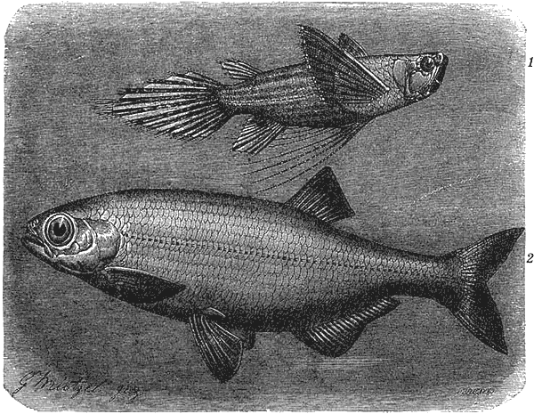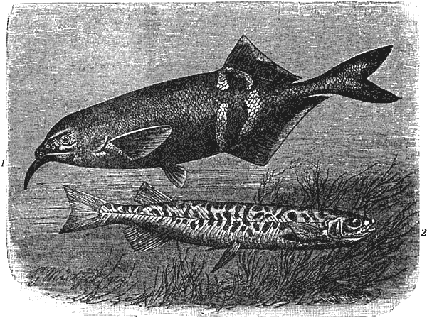 1 – Пресноводная рыба-бабочка (Pantodon buchholzi) 2 – Луноглазка, или серебристый гиодон (Hiodon tergisus)