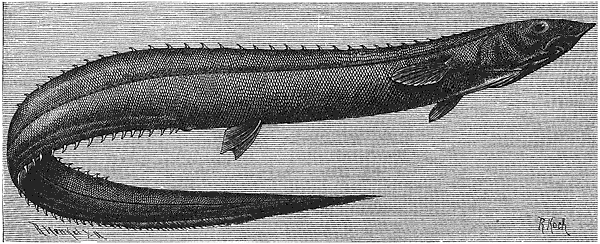 Наиболее отличается от всех остальных колючеперых – спиношип (Notacanthus rissoanus). Тело длинное, покрытое мелкими чешуйками, голова острорылая, спинной и заднепроходный плавники своеобразной конструкции. Эти виды распределяются по Северному, Атлантическому океанам и Средиземному морю, а равно и по южной части Тихого океана. Все известные виды живут на значительных глубинах и водятся, вероятно, в слоях на глубине 100–200 саженей. Один экземпляр, около 40 см длиной, вида, представленного здесь на рисунке, был вытащен с глубины 1875 саженей; вид этот, однако, встречается и в Средиземном море[95]95