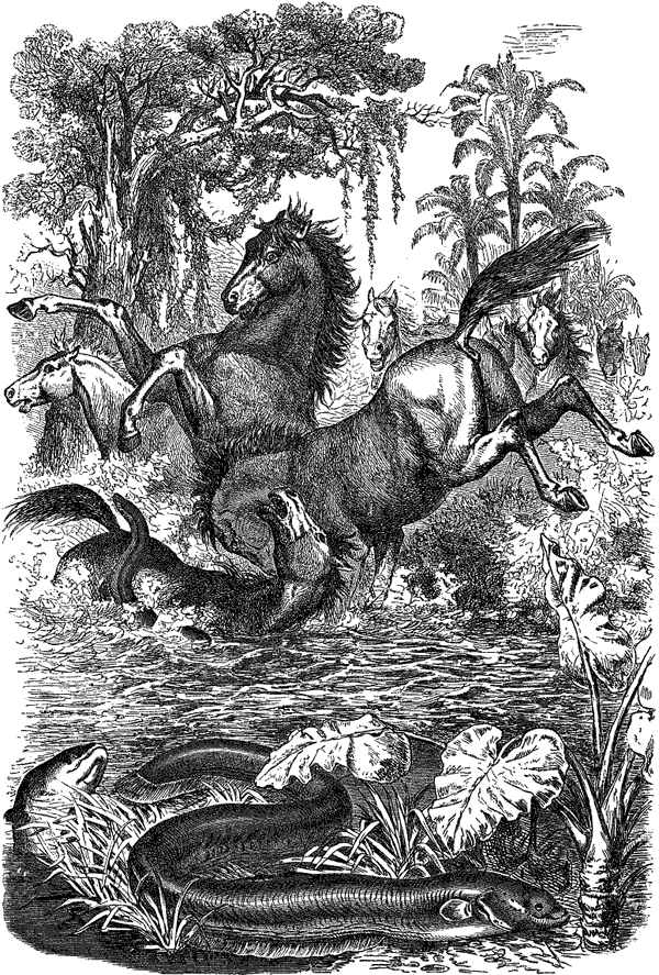 Электрический угорь (Electrophorus electricus). Иоганн Мюллер описывает отличительные признаки этих рыб следующими словами: «Пасть их спереди ограничивается межчелюстной костью, а по бокам верхней челюстью; плечевой пояс прикрепляется к самой голове; слепые кишки у них имеются, а задний проход помещается на горле; яйцевод имеет вид кишки, семенные железы с выходным протоком». К этому мы можем еще присовокупить, что спинного плавника нет, а вместо него очень длинный заднепроходный плавник и два соединенных воздушными каналами плавательных пузыря. Электрические угри отличаются отсутствием чешуи, толстой кожей, покрывающей грудной и заднепроходный плавники, и зубной системой, состоящей из многочисленных мелких острых зубов в челюстях, небольшим рядом зубов на переднем небе и двумя рядами за передними зубами нижней челюсти.