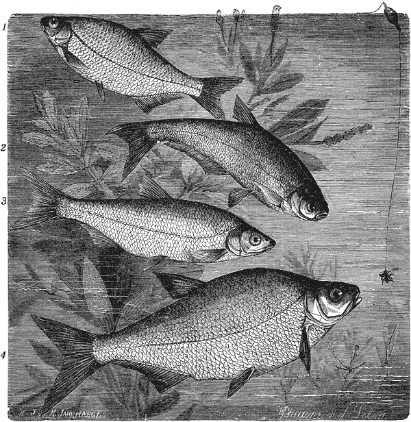 1 – Густера (Blicca bjoerkna) 2 – Синец (Abramis ballerus) 3 – Сырть, или рыбец (Vimba vimba) 4 – Лещ (Abramis brama)
