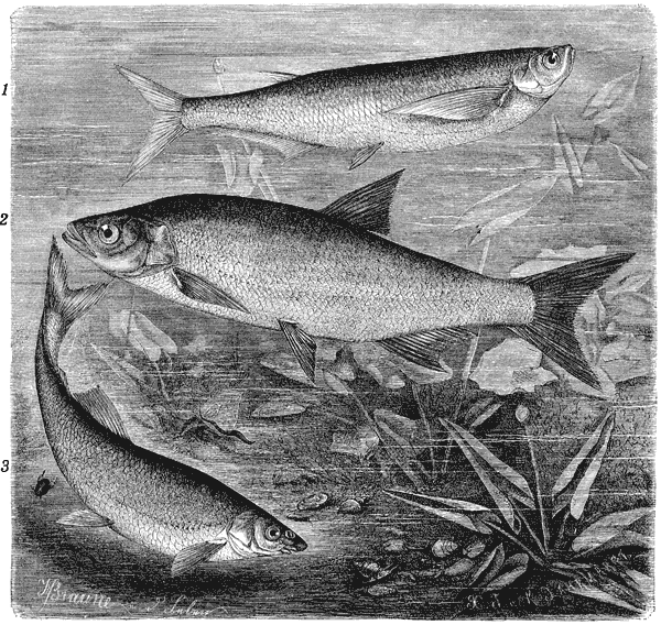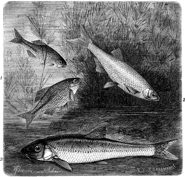 1 – Чехонь, или сабля рыба (Pelecus cultratus) 2 – Обыкновенный жерех (Aspius aspius) 3 – Обыкновенный подуст (Chondrostoma nasus)