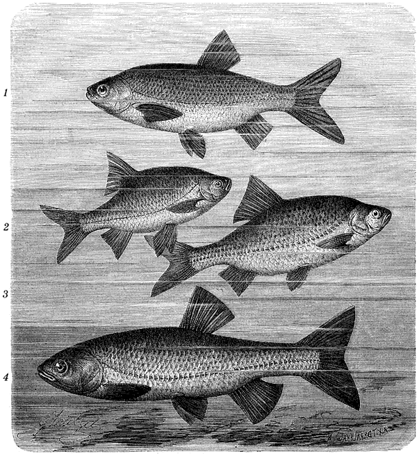 1 – Язь (Leuciscus idus) 2 – Красноперка (Scardinius erythrophthalmus) 3 – Обыкновенная плотва (Rutilus rutilus) 4 – Голавль (Leuciscus cephalus)