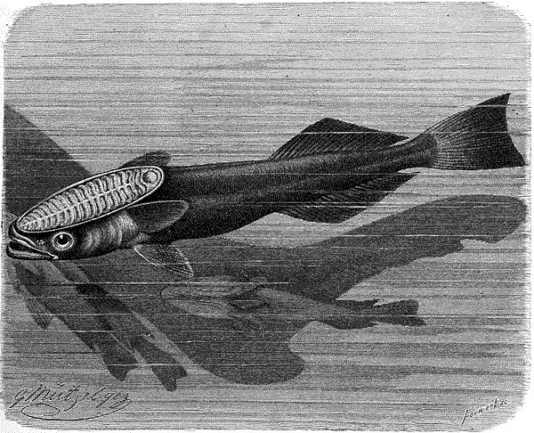 Способ их прикрепления легко объясняется. Их присасывательный кружок действует подобно кровососной банке. Они придавливают многие листочки к краю, прижимают поверхность, сделавшуюся ровной, к тому, к чему прикрепляются, затем приподнимают снова некоторые поперечные листочки, и таким образом образуется безвоздушное пространство, которое позволяет действовать полному давлению воды. Их головная пластинка действует не так, как настоящая присоска, но довольно сходно. Они плавают вовсе не так плохо, как обычно думают, хотя их движения кажутся довольно неловкими и производятся исключительно хвостовым плавником. На пойманной акуле они обыкновенно держатся, пока часть, к которой они прикрепились, находится в воде, и, если рыбу вытащат, тогда они отделяются и пристают к кораблю. Киттлиц наблюдал также и обратное: он поймал нескольких из них, которые и на воздухе так плотно оставались на пойманной акуле, что их нужно было отрывать с силой.