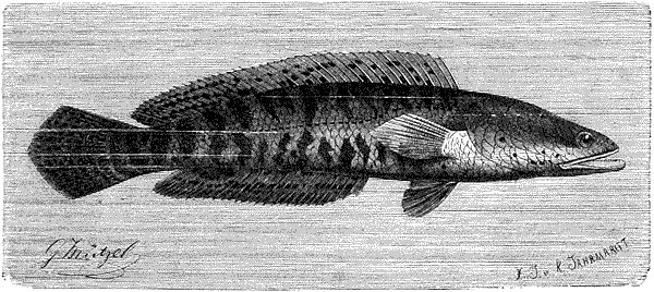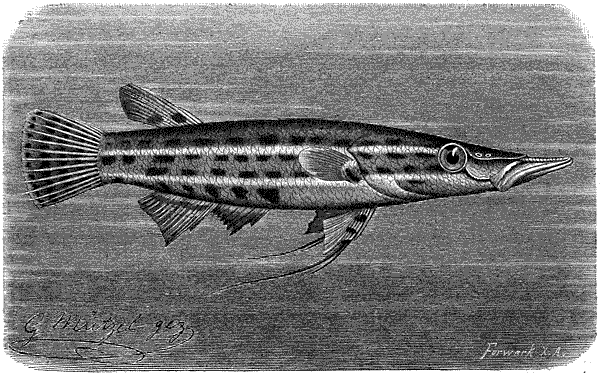 Красивый щукоголов (Luciocephalus pulcher) – небольшая пресноводная рыба островов Малайского архипелага. Для полноты нашего очерка мы даем здесь рисунок этой рыбы, хотя об образе жизни ее сообщить ничего не можем.