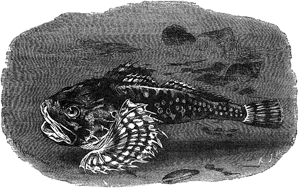Скорпена, или морской ёрш (Scorpaena porcus), довольно обыкновенна в Средиземном море и Атлантическом океане и местами даже попадается очень часто. Она достигает в длину от 20 до 25 см и разрисована на спине по бурому, а на брюхе розово-красноватому фону многочисленными мраморными пятнами[278]278