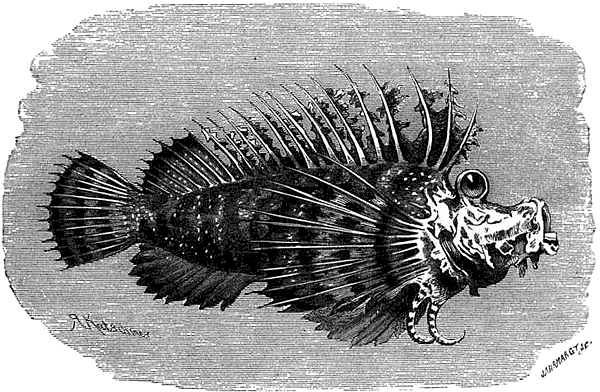 Эта скорпена ужасного вида, голова ее кпереди как бы вдавлена и поэтому имеет форму седла. Если захотеть перечислять все крючки, наросты, придатки, особенности и уродливости этой рыбы, то этому не будет конца. Морда похожа на морду гиппопотама; голова еще имеет отдаленное сходство с головой рыбы; глаза расположены как бы на стебельках, очень сближены друг с другом и повернуты кверху. Туловище удлинено, и брюхо вздуто, а спина гораздо выше, чем голова. На челюстях помещаются тонкие бархатистые зубы. Кожа мягкая и ноздреватая, местами имеет наросты и придает животному еще более отвратительный вид. По серому фону разбросаны бурые мраморные полосы и слившиеся пятна, белые точки и полосы, принимающие на голове разнообразные оттенки вплоть до розово-красного. Внутренняя сторона грудных плавников белая с розовым отливом и с черными пятнами по краям. Брюшные и заднепроходный плавники коричневого цвета; хвостовой плавни к украшен по светлому фону светлыми полосками.