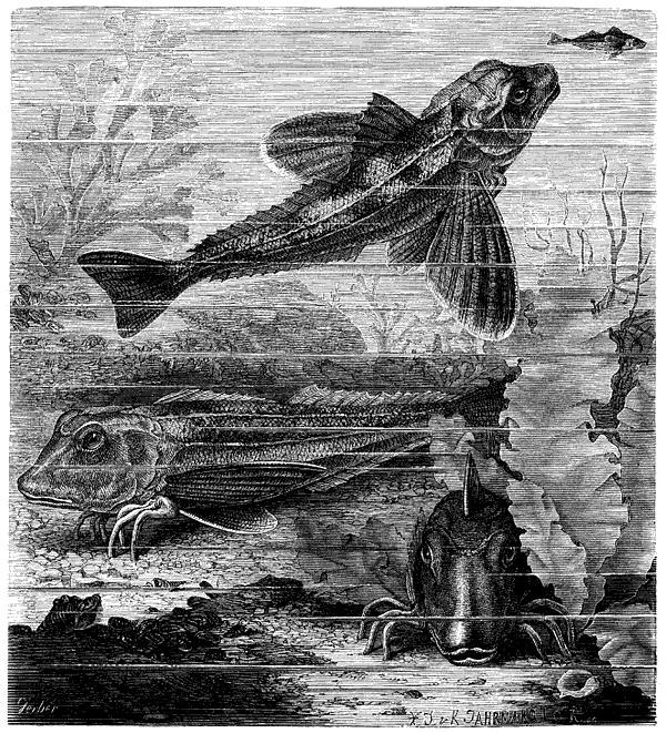 [Закрыть]. Ласепед считает себя вправе сомневаться в истине этого сообщения, но оно вполне подтверждается позднейшими наблюдениями. Так, Джонстон, передавая сообщения рыбаков, рассказывает, что самец своим телом закрывает яйца и остается в этом положении, пока молодые рыбки не вылупятся из икры. Вскоре после того рыбешки присасываются к бокам и спине самца и последний удаляется от берега вместе с дорогой ношей и уносит свое потомство на более безопасную морскую глубину.