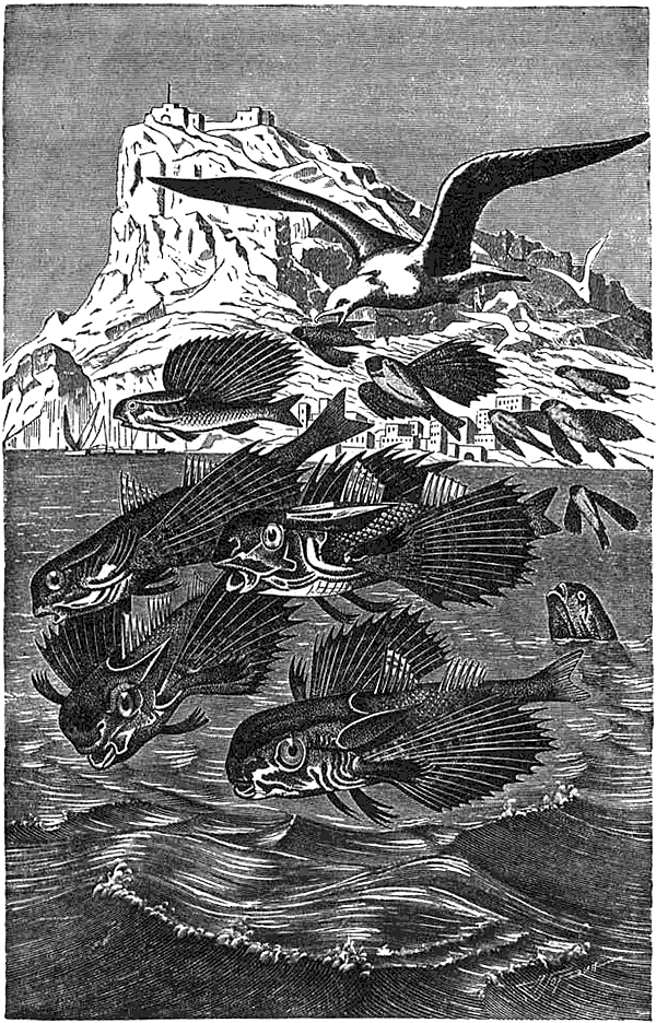 В большем или меньшем расстоянии от борта корабля замечают целые стаи таких рыб, которые внезапно поднимаются из волн и со своеобразными свистящими ударами больших грудных плавников проносятся над водою, на высоте 4–5 м от поверхности; пролетевши таким образом 100–120 м, они опять исчезают в волнах[291]291