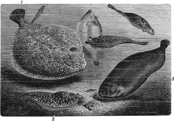 1 – Большой ромб, или тюрбо (Psetta maxima) 2 – Морская камбала (Pleuronectes platessa) 3 – Европейский морской язык (Solea vulgaris)