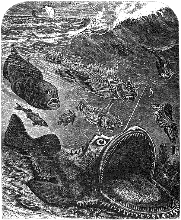 [Закрыть]. «Морские жабы, – рассказывает Геснер, – говорят, отвратительные и гадкие животные; в некоторых местах они имеют в длину три фута и столь широкую пасть, что могут проглотить обыкновенную охотничью собаку. Мясо их вязкое; они по форме плоские, окрашены в бурый или черный, как сажа, цвет, с очень крупной и широкой головой, так что даже вблизи ничто не указывает на рыбу. Нижняя челюсть выдвигается далеко за верхнюю, и потому их пасть постоянно открыта. На голове и вокруг глаз у нее много колючек и шипов; обе ее челюсти и язык полны зубов. Впереди на голове она имеет два хохолка и несколько меньших – сзади на спине, которые, говорят, очень худо пахнут. Если ту рыбу выловить и, сильно растянув, внутри ее поставить свечу, тогда получится отвратительный фонарь; но и без того эта рыба считалась отвратительной, и недаром некоторые народы называют ее морским чёртом. Эти рыбы, говорят, обитают у берегов, поросших травой, и очень прожорливы, преследуют человека, примечают плавающих, схватывают ослабевших, тащат на дно и наконец пожирают. Морская жаба так сильно наполняется другими рыбами, что прибрежные жители, поймавши крупный экземпляр, разрезают ее, чтобы взять из брюха свежих рыб. Существует много рыб, которые с особенным лукавством и обманом, так им определено природой, добывают себе пищу и кормятся. В этом, говорят, морская жаба превосходит других; ибо, как слышно, она имеет впереди у своей пасти рожки, которыми шевелит в иле или грязи, как будто это черви, на которых охотятся мелкие рыбы; рыбки приплывают на эту приманку и пожираются ею. Мясо этих животных, говорят, непригодно для пищи, ибо оно на вкус скверное и имеет отвратительный запах. Все же, говорят, наилучшая часть – брюхо». Это описание, в общем, правильно, ибо удильщикообразные, действительно, живут совершенно так, как это описывает Геснер, еще и теперь вызывают в каждом отвращение и, поистине, так прожорливы, что и в настоящее время английские рыбаки вырезывают у описанного Геснером вида брюхо, чтобы взять находящихся в нем рыб.