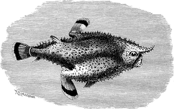 Почти на всех языках носит одно и то же название весьма странная луна-рыба, или «плавающая голова», причем выраженные этими названиями сравнения говорят сами за себя. Луна-рыба (Mola mola) имеет необыкновенно короткое, сжатое туловище и замечательно высокие и острые спинной и заднепроходные плавники, соединяющиеся с коротким широким хвостовым плавником и вовсе не соответствующие небольшим круглым грудным плавникам. Зубная система такая же, как у рыбы-ежа, так как у луны-рыбы тоже нет бороздки в эмали, покрывающей зубную челюсть. Относительно внутреннего строения надо заметить, что известные виды этого рода имеют маленький желудок, непосредственно прилегающий к пищеводу, но у них нет переднего желудка, приспособленного к вздутию, а также и плавательного пузыря. Форма луны-рыбы короткая, овальная, а в молодости почти круглая; кожа толстая и шероховатая, окраска обыкновенно грязно-серо-бурая, которая к брюху становится светлее. По величине эта рыба превосходит всех своих родичей, так как попадались экземпляры в 2–2,5 м длиной и более 300 кг весом[300]300