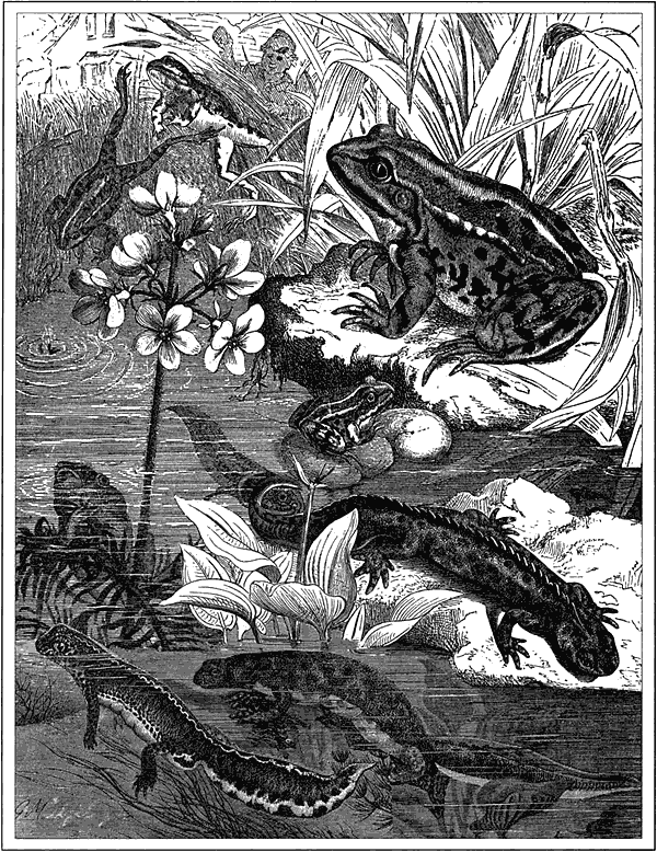 Глубокая пропасть отделяет всех вышеописанных позвоночных животных от предстоящих к описанию. Первые на всех ступенях своего развития дышат легкими, громадное большинство последних до известного возраста дышит жабрами. У животных класса, которым мы займемся, почти всегда имеет место превращение, как это обыкновенно встречается у беспозвоночных, т. е. земноводные, выйдя из яйца, не имеют строения и организации тела родителей, но становятся похожими на них лишь впоследствии с переходом из личиночного состояния во взрослое.