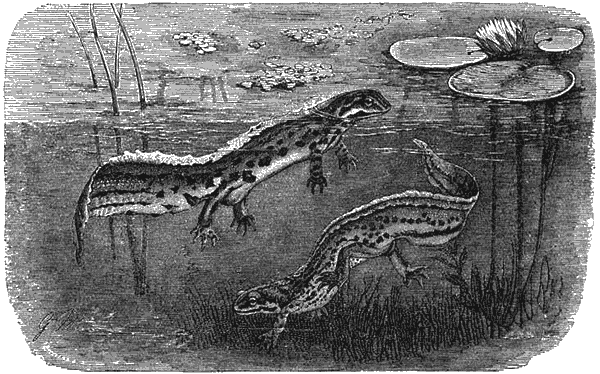 Обыкновенный тритон (Tritirus vulgaris) достигает 7,5–8,5 см длины и отличается своей височной дугой, состоящей только из сухожилия, гребень на спине зубчатый, самцы имеют на задних ногах пальцы, отороченные лопастями, брюшко пятнистое, на голове замечаются два неправильных ряда вдавленных железистых ямок, хвост на конце заостренный. Сверху тритон этот оливково-зеленого или бурого цвета, переходящего по бокам в нежный слабо-серебристый желтовато-белый цвет, нижняя сторона тела оранжево-желтая. На всем теле замечаются темные пятна.