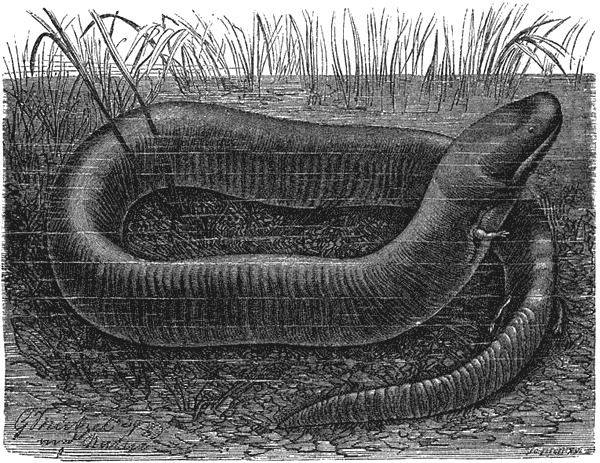 Об образе жизни этого животного мы знаем примерно следующее. Угревидная амфиума живет в болотах и других стоячих водах юго-восточной части Соединенных Штатов в Северной Америке от Луизианы до Южной Каролины, но не встречается на запад от Луизианы и в долине Миссисипи севернее Арканзаса. Она плавает довольно быстро, извиваясь, как угорь, но часто зарывается в ил, зимой даже на метр глубины, буравя мягкую землю, как земляной червь. Пойманные экземпляры, которые случайно выпадали из своих бассейнов, жили без всякого вреда для себя по нескольку дней на суше и выдерживали перевозку в Европу[359]359