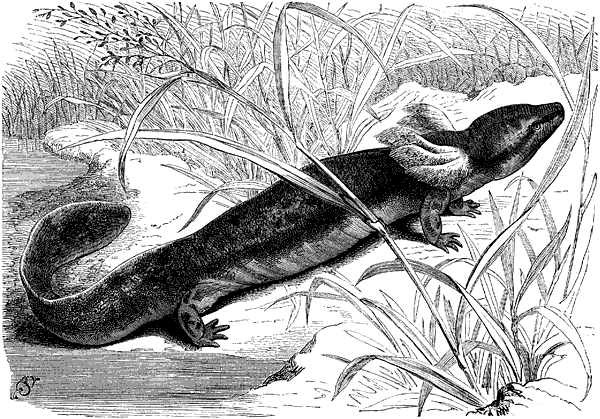 Это большое и неуклюжее животное развивается из очень маленьких яиц. Японский натуралист Сасаки удостоверился, что самка исполинской саламандры кладет в августе и сентябре яйца, соединенные в виде шнуров: яйца эти имеют от 4 до 6 мм длины и одинаково закруглены на обоих концах. Согласно всем сделанным наблюдениям, самые маленькие, до сих пор найденные японские саламандры имели 15 см длины и во всем были похожи на взрослых. По всей вероятности, в начале своего развития они имеют наружные жабры и для подтверждения этого следует упомянуть, что Мартенс в одном японском сочинении нашел изображение этой саламандры, окруженной детенышами, у которых по сторонам головы были изображены пучки жабр[355]355