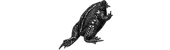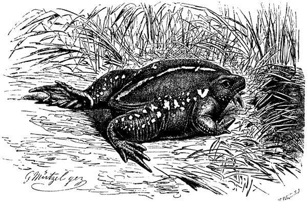 [Закрыть], который отличается от всех других жаб тем, что язык его сзади приросший и подвижен только спереди, зрачок имеет вид вертикальной щели, а грудная кость мало развита. Животное это называется носатой жабой (Rhinophrynus dorsalis), служит единственным представителем рода Rhinophrynus и принадлежит к числу самых безобразных и странных животных этого отряда. Туловище этой жабы почти яйцевидное, голова срослась с туловищем и оканчивается клювовидным рылом; передние конечности коротки и толсты, задние также толстые и имеют 5 пальцев, соединенных широкими плавательными перепонками, причем внутренний палец имеет вид короткого бугорка; на нижней стороне ступни торчит лопатовидный роговой бугорок. Барабанная перепонка незаметна, и заушных желез нет. Тело окрашено в однообразный бурый цвет с желтой полоской посреди спины и многими желтыми пятнами по сторонам тела. Длина равняется 6 см. За углом рта у самца есть внутренний голосовой мешок.
