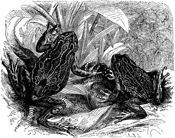 [Закрыть]. Многие виды, как, например, Megophrys и Leptobrachium, достигают значительной величины, а последний род еще замечателен тем, что это единственная лягушка, самцы которой в случае нападения защищаются даже от человека: они открывают широкую пасть, громко кричат и стараются укусить руку. Сильные челюсти живущей в Бирме Leptobrachium carinense позволяют ей схватывать не только насекомых, но и маленьких млекопитающих. Феа нашел в желудке этого вида маленькую белку.