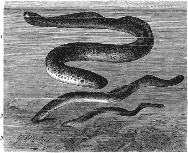 [Закрыть]. Это животное бывает при 18 см длины толщиной не более гусиного пера, голова у него маленькая, с едва заметными глазами; жаберные отверстия лежат в глубоких продольных бороздках, на коже очень заметные кольца; серебристо-матовый цвет на плавниках переходит в желтовато-белый. Оно встречается почти везде в значительном количестве, держится в водах с песчаным или илистым дном и напоминает своим образом жизни больше червей, чем рыб, к которым поэтому и причислено только после тщательного анатомического исследования. Подобно червям, пескоройки вкапываются в ил, который добровольно не покидают почти никогда, а пускают в дело свои плавники, только когда хотят вновь спрятаться в ил или в другое подобное место. Особенно охотно заползают они в пучки льна, положенные в воду для мочки, почему и носят в некоторых местностях название льняного угря, так как их находят во льне, когда вынимают его из воды и раскладывают на лугах для беления. Во многих местах охотятся за пескоройками и, отрубив им голову, варят в вине с маслом, лимонным соком и очень ценят как вкусное кушанье. Но простолюдин пренебрегает ими из-за их червеобразной формы, а рыбаки обыкновенно употребляют их только как наживу, потому что они очень живучи и, даже сильно раненые, живут или, по крайней мере, двигаются еще целыми сутками. Все естествоиспытатели смотрели на пескороек как на рыб, схожих с миногами, но никому из них не пришло в голову признать в них близкого родственника этих рыб.