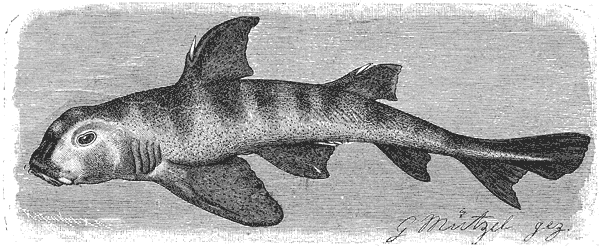 [Закрыть], получившую свое немецкое название (Krausenhai) благодаря широким кожистым складкам, прикрывающим жаберные щели. Японский экземпляр этой рыбы, полученный Гюнтером из бухты у города Йеддо, против Токио, был почти 1,5 м длины. Гюнтер причисляет этот вид к глубоководным рыбам.