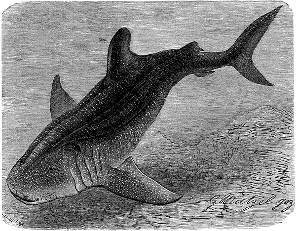 [Закрыть]. Длина ее достигает 15 м, а может быть и 21 м. «Эта акула, – говорит Гюнтер, – совершенно безвредна; зубы у нее очень маленькие, но многочисленные и расставлены широкими полосами; говорят, что она питается морскими водорослями, но это сведение требует еще подтверждения. Рыло ее очень широкое, короткое и плоское; глаза очень малы».