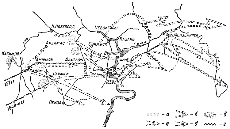 а – расселение казанцев до 1552 г.; б – движение казанцев после 1552 г.; в – расселение мишарей до 1552 г.; г – линии засечных черт (1659 г. – год завершения строительства); д – движение мишарей до 1552 г.; е – движение мишарей после 1552 г.
