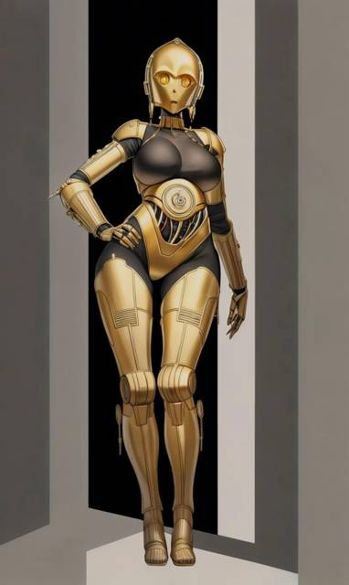 Когда к каркасу дроида приделали репульсоры, стало понятно, что просто так их не замаскируешь, и тут в мою голову пришла «гениальная» идея – надо просто придать дроиду женский облик, и в пышных формах можно много чего замаскировать. Знал бы я тогда, к чему это приведёт… В итоге, полученный дроид получил наилучшую из всех доступных кинематику, а также новейшее программное обеспечение, компактные репульсоры, микрореактор, скрытое оружие, активируемый щит, и память, точнее, языковые базы исходного протокольника.