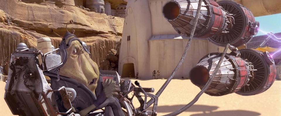 Дальше, в финальной части трассы, шёл относительно ровный участок. Но и тут не обошлось без сюрпризов. Раньше, в первых этапах гонки, наверху по обе стороны скал располагались тускены. Они выцеливали гонщиков и стреляли по их подам из своего кинетического оружия. Сейчас же, они переместились на скалы недалеко от финиша и по готовности, должны были выстрелами внести немного разнообразия в кровавые гонки Татуина.
