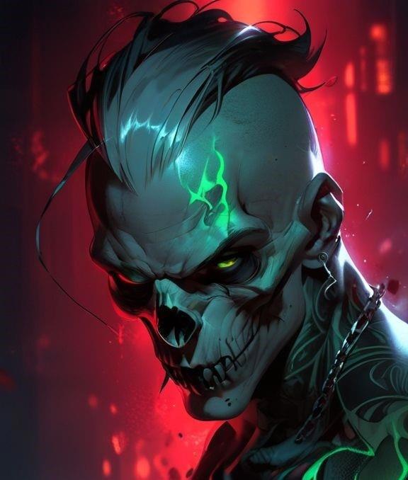 По капюшонами у них скрывали уродливые лица. Это была смесь того, как рисуют панков и личей разные художники комиксов. Выбритые виски, абсолютно у всех, отсутствие бровей и тёмные круги вокруг глаз. Сами глаза светились нездоровым зелёным светом. Нос отсутствовал как класс. Вместо него были впадины, как у голого черепа. В мочках ушей у всех были какие-то серьги. Губ, также как и носа, не было. Зубы торчали наружу на всеобщее обозрение, придавая им ещё более жуткий вид. На шеях были видны следы от каких-то татуировок, что также светились зелёным, но также от ни шла некая дымка.