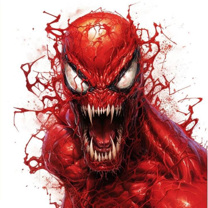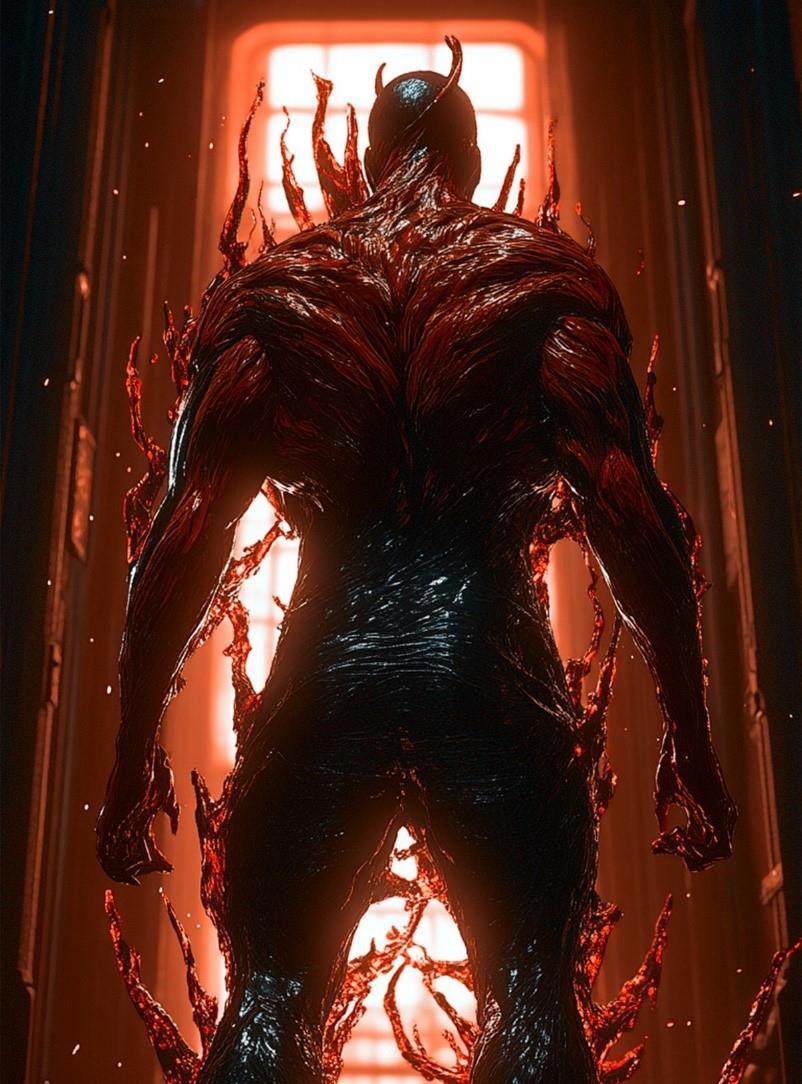 Он повернулся и увидел испуганное лицо своей подруги, что смотрела на него и никак не могла отвести взгляд своих изумрудных глаз. Во время поворота, парню удалось увидеть своё отражение в большом зеркале бельевого шкафа и ему захотелось крепко выругаться. На него смотрел самый натуральный Карнаж. Будто бы эта реальность решила, что раз Юджин случайно лишил её оригинального, то нужно сделать другого, похожего внешне из него.