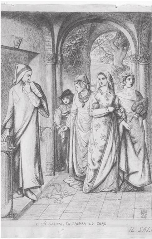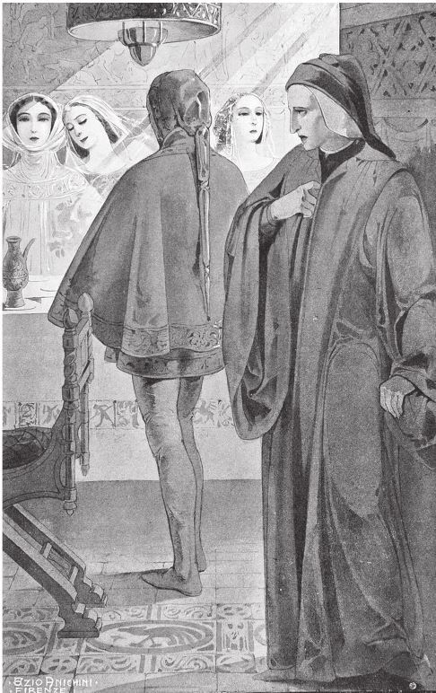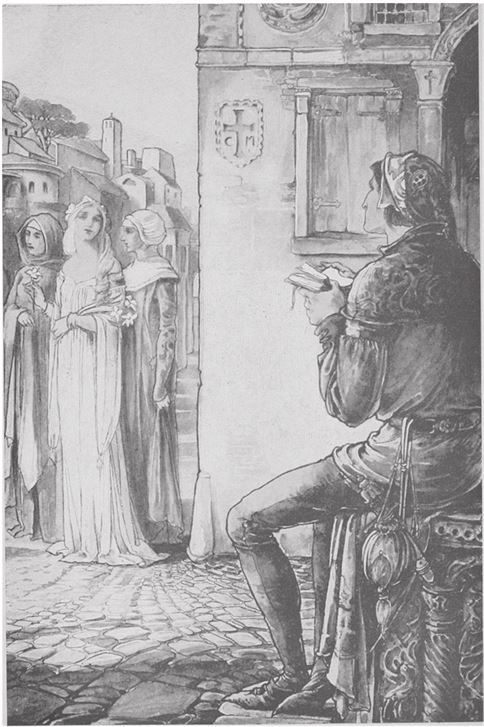Итак, многие люди по виду моему поняли мою тайну; и случилось однажды, что некоторые донны, собравшись вместе, развлекались обществом друг друга; казалось, сердце мое было им открыто, ибо каждая из них присутствовала при какой-нибудь моей неудаче. Когда я проходил мимо них, как будто влекомый судьбою, меня окликнула одна из этих благородных донн, и та, которая позвала меня, была очень бойка на язык. А я, присоединившись к их обществу и убедившись, что моей благороднейшей не было среди них, ободрился и, приветствуя их, спросил, что им от меня угодно.