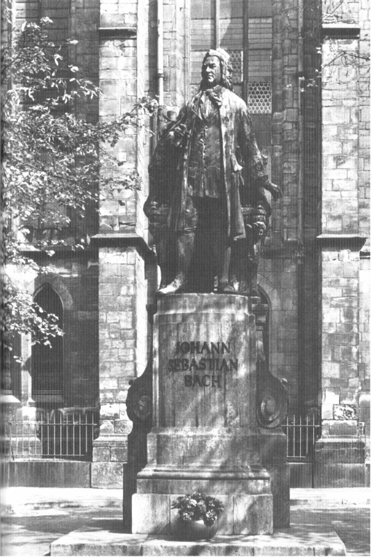 ...И вот мы в сегодняшнем Лейпциге. Идем по той священной для нас земле, по которой когда-то ступал Иоганн Себастьян Бах, и подходим к церкви Св. Фомы – простому и в то же время торжественно-величественному зданию. Перед входом в церковь – скульптурная фигура Баха. Композитор стоит со свертком нот в одной руке, в очень живой позе, как бы делая шаг навстречу нам. Левая рука отброшена назад, что придает всей фигуре особенную динамичность. Мы поднимаем глаза к его лицу, живому и сильному, и долго всматриваемся в его мужественное и светлое выражение.