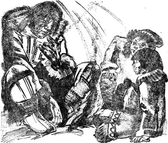 Была еще зима, разгар промысла на белок, когда однажды ночью на зимней стоянке собаки подняли невообразимый лай. В чуме Хэйкогиров поднялся переполох. Соскочил, как молодой, отец Кинкэ, молчаливый Колокон, схватился за ружье. Сбросили одеяло сыновья Кумонда и Кутуй, жившие в чуме отца. Перепугалась Эки. Она стала оживлять потухший огонь, запричитала: