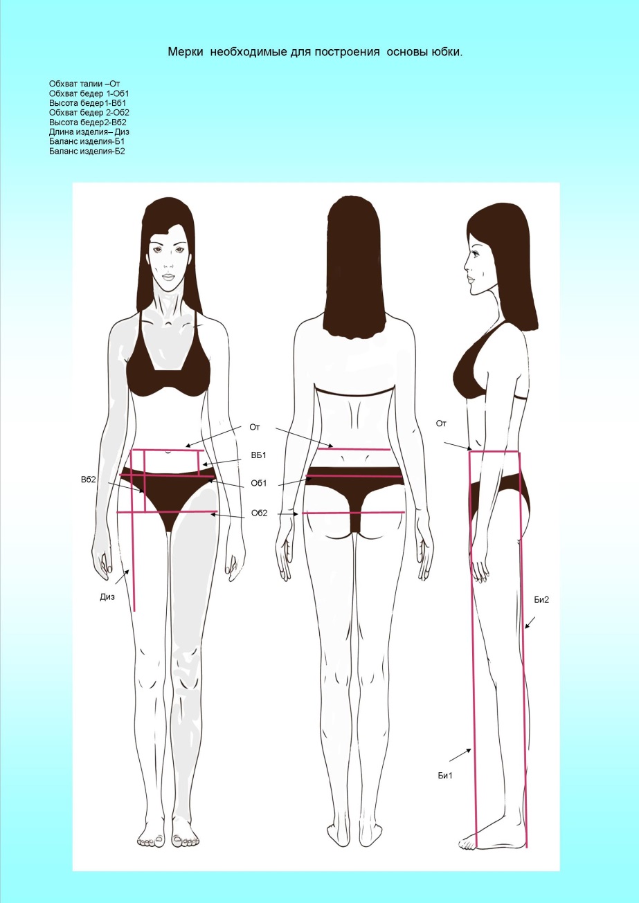 Конструирование одежды в индивидуальном пошиве в основном выполняется по измерениям фигуры с минимальным количеством расчетных формул. И все же, несмотря на то, что трудно построить изделие только по измерениям, его в основном выполняют именно с их помощью. Снятие мерок с фигуры – это самый ответственный момент в изготовлении одежды. От того как закройщик владеет этими навыками, зависит посадка изделия и его прилегание. Приступая к снятию мерок необходимо определить точно линию талии, так как от нее зависит точность основных балансовых и вспомогательных измерений. Фигуру подпоясывают тонкой тесьмой или резинкой. Измерять фигуру необходимо без припусков на свободное облегание. При этом необходимо следить, заказчица должна стоять свободно, не меняя привычной для нее осанки. Снятие мерок выполняется без свободного облегания. Сложность изготовления юбок заключается в том, что фигуры людей имеют слишком большое разнообразие. Например, живот, выступающий или впалый, форма живота, ягодицы подняты слишком или опущены, ягодицы могут резко выступать или быть плоским, слишком выступающие бедра или боковые стороны фигуры ровные. Юбкой все недостатки необходимо скрыть, а достоинства подчеркнуть.