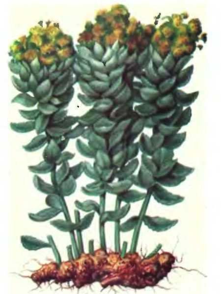 Родиола розовая – многолетнее травянистое растение с крупным клубневидным корневищем, от которого отходит несколько прямостоячих неветвистых густоолиственных стеблей. Листья продолговато-яйцевидной формы, с редкомелкозубчатым краем, мясистые, сидячие, очередные. Цветки желтые или слегка красноватые, собраны в щитковидные соцветия, расположенные на верхушках стеблей (рис. 8). Цветет в июне-июле, семена созревают в августе. Распространена родиола розовая на севере европейской части СССР, в Восточной Сибири, на Тянь-Шане, Дальнем Востоке, Чукотке. Основные промышленные заросли находятся на Алтае на высоте 1500–2500 м над уровнем моря. Встречается растение по берегам горных рек, каменистым склонам в равнинных и горных тундрах Севера.