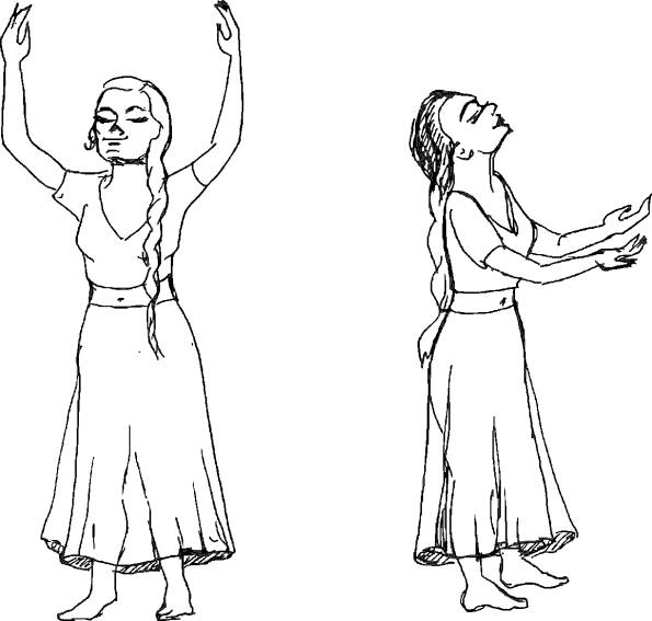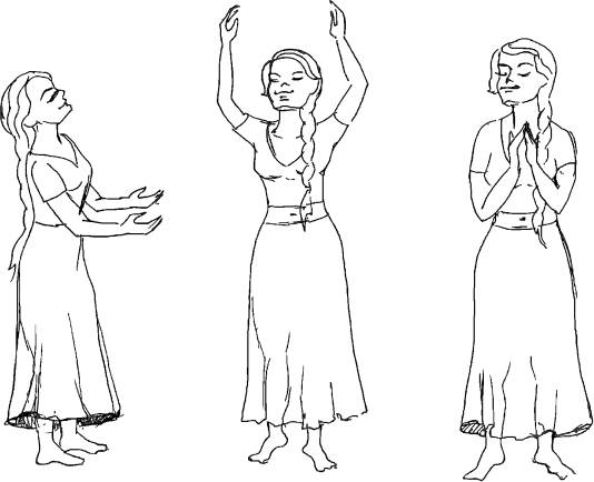 Я в божественном пребываю (руки намасте поднимаются вверх, а потом разводятся в стороны).