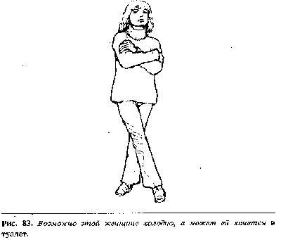 Второе, когда человек замерзает, он может обхватить себя руками. Если его ноги скрещены, они, обычно, прямые, напряженные и тесно прижатые друг к другу (рис. 83), что будет отличаться от более расслабленной позиции ног при защитной позе.