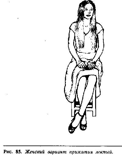 Скрещенные или сложенные на груди руки, закинутая нога на ногу предполагают, что человек находится в оборонном или негативном состоянии, но то же самое может быть выражено с помощью сведенных вместе лодыжек. У мужчин прижатые лодыжки обычно сочетаются с крепко стиснутыми кулаками, лежащими на коленях, или руки могут впиваться в подлокотники стула (рис. 84). Женский вариант слегка отличается: колени сведены вместе, ноги могут быть наклонно отведены в одну сторону, руки лежат или параллельно друг другу на коленях, или одна рука поверх другой (рис. 85).