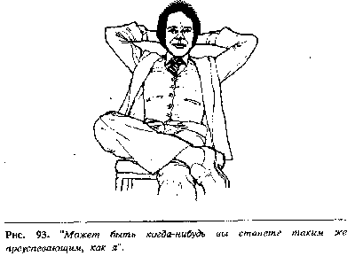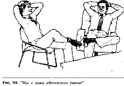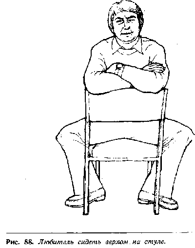 Много веков назад мужчины пользовались щитами, чтобы защититься от копий и дубинок врагов, а сегодня цивилизованный мужчина использует все, что попадется под руку для такого символического щита, которым он защищается от физического или словесного нападения. Это может быть укрытие за забором, дверью, столом, открытой дверцей машины или спинкой стула во время сидения на нем верхом (рис. 88). Спинка стула служит защитным средством и может превратить его в агрессивного, атакующего воина.