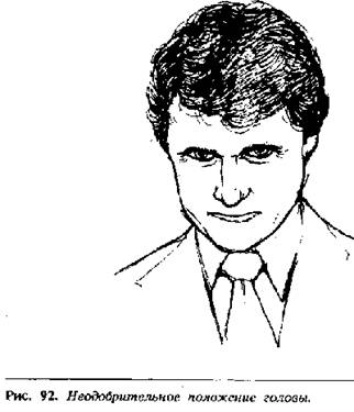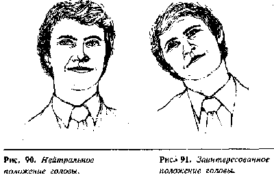 Существуют три основных положения головы. Первое – прямая голова (рис. 90). Это положение головы характерно для человека, нейтрально относящегося к тому, что он слышит. Голова обычно неподвижна, и время от времени делаются маленькие кивочки головой. При этом положении головы часто используются «рука-к-лицу» оценочные жесты.