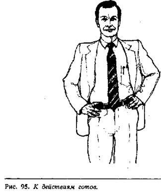 Чтобы сделать правильные выводы относительно намерений человека, поставившего руки на пояс, необходимо рассматривать обстоятельства, при которых это происходит, и понаблюдать за предшествующими жестами. Ряд последующих жестов может укрепить вас в своем мнении. Например, расстегнут ли пиджак и откинуты ли полы пиджака на спину, или он застегнут в тот момент, когда человек ставит руки на пояс? Агрессивная поза при застегнутом пиджаке показывает сильное расстройство, в то время как расстегнутый пиджак и откинутые фалды (рис. 95) есть чисто агрессивная поза, потому что человек открывает область сердца и горла, выказывая невербально бесстрашие. Это поза может быть более усилена, если человек расставляет широко ноги или сжимает пальцы в кулаки.