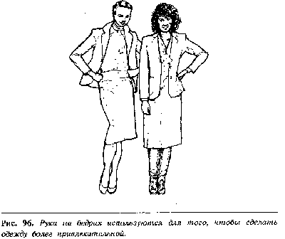 Жесты агрессивной готовности используются профессиональными манекенщицами, чтобы передать, что их одежда предназначена для современной, агрессивной, предприимчивой женщины. Иногда этот жест проделывают только одной рукой на бедре, другая рука принимает иное положение (рис. 96). При этом жесте часто наблю-даются жесты критической оценки.