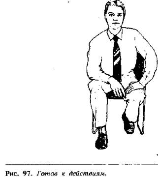 Жесты готовности, сигнализирующие о желании закончить разговор или встречу, выражаются подачей корпуса вперед, при этом обе руки лежат на коленях (рис. 98), или обе руки держатся за боковые края стула (рис. 99). Если любой из этих жестов появляется во время разговора, было бы разумно с вашей стороны взять инициативу в свои руки и первым предложить закончить беседу. Это позволит вам сохранить психологическое преимущество и контролировать ситуацию.