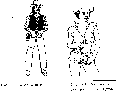 Сексуальная агрессивная поза выражается следующим жестом – большие пальцы рук затыкаются за пояс или за прорези карманов. Это один из наиболее популярных жестов, используемых актерами телевизионных вестернов, чтобы показать мужественность любимых героев-гангстеров (рис. 100). Руки находятся в положении готовности и служат центром притяжения внимания, акцентируя область гениталий. Мужчины используют этот жест, чтобы отметить свою территорию или показать другим мужчинам, что они их не боятся. Когда жест используется в присутствии женщин, он может истолко-вываться так: «Я мужчина. Я над тобой властвую».