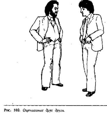 На рисунке 102 показаны двое оценивающих друг друга мужчин, использующих характерные жесты – руки на бедрах и пальцы за пояс. Учитывая, что они оба несколько отвернулись друг от друга, и нижние половины их тел не напряжены, можно предположить, что мужчины подсознательно оценивают друг друга, и что нападение маловероятно.