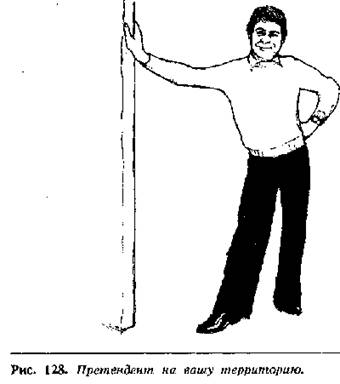 Люди прислоняются к объектам или друг к другу для того, чтобы заявить свои территориальные претензии на этот предмет или человека. Если человек прислоняется к тому, что ему не принадлежит, то этот жест используется как вызов или стремление подчеркнуть свое превосходство. Например, если вы хотите сфотографировать вашего друга на фоне его новой машины, лодки, дома или еще какой-нибудь собственности, вы обязательно увидите, как он обопрется о – свою вновь приобретенную собственность, поставит на нее свою ногу или положит руку (рис. 127). Когда он прикасается к своей собственности, она становится продолжением его тела, и таким способом он показывает другим, что это принадлежит ему. Влюбленные постоянно держатся за руки или обнимаются на людях в общественных местах, чтобы показать другим, что они имеют право друг на друга. Руководитель отдела кладет свои ноги на стол или на ящики письменного стола, а также может опереться на косяк входной двери в офисе, чтобы подчеркнуть свое право на этот офис и его мебель.